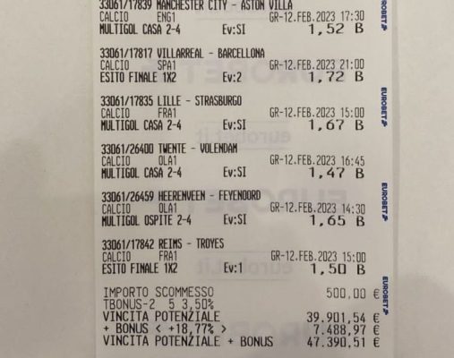 Nel bar è presente un corner Eurobet, presso il quale il fortunato e bravo scommettitore ha effettuato una giocata su 9 partite. Gli incontri riguardavano le partite di campionati italiani (serie A, B e C), Inghilterra, Spagna, Francia e Olanda. Ebbene, l’utente del corner Eurobet ha centrato tutti i pronostici portandosi a casa, grazie anche ad un super bonus di quasi 7.500 euro, una ricchissima vincita da 47.390 euro.