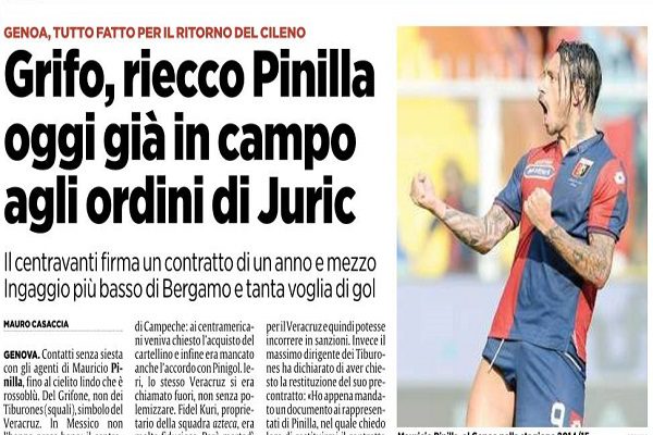 Secolo XIX: “Genoa, riecco Pinilla. Oggi visite e primo allenamento”