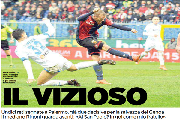 Due gol nelle ultime due partite, gol decisivi, gol da sei punti. La salvezza del Genoa è merito di Rigoni? «Mi sono fatto trovare al posto giusto nel momento giusto, sono stati due gol importanti. Ma conta poco chi li abbia segnati, sono state due vittorie merito dell’intera squadra. La salvezza non è ancora stata raggiunta, non dobbiamo mollare ma adesso stiamo facendo vedere tutte le nostre qualità».
