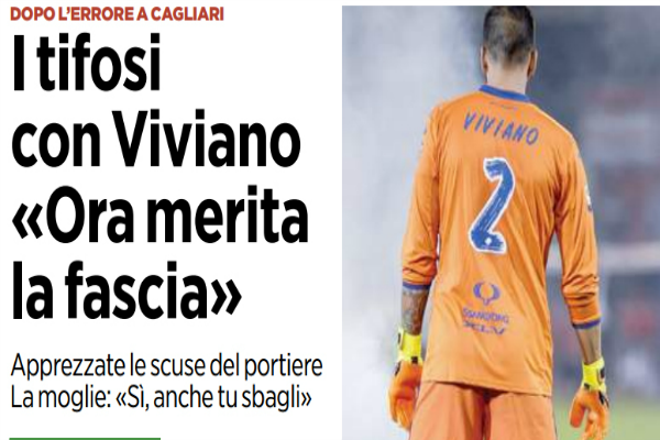 “Quasi tutti con Emiliano Viviano: i Social, ormai la piattaforma virtuale dove le emozioni fluiscono in tempo reale, assolvono il portiere fiorentino e anzi chiedono per lui la fascia da capitano per la sfida di domenica contro il Palermo, tra l’altro la sua ex squadra. Se non è un plebiscito per il numero 2 della Samp poco ci manca. Certo, tutti i tifosi hanno imprecato in diretta contro di lui alla vista del goffo liscio che ha spalancato la porta a Melchiorri e regalato al Cagliari l’insperato 2-1. E a qualcuno la carogna sarà durata qualche ora, perché oggettivamente quell’uscita fuori area con il corpo messo male per spazzare in tribuna di sinistro invece che andarci col destro e spazzare in avanti, è da Mai dire Gol, fa ridere o piangere ma non può lasciare indifferenti. Ma il fatto che il portiere sia subito dopo comparso in tv, nelle interviste a caldo, per prendersi le colpe del punto perso e chiedere scusa,ha fatto sì che questo“infortunio tecnico” (definizione di Giampaolo) sia diventato quasi una prova d’amore tra Viviano e la tifoseria blucerchiata. Prova decisamente superata a giudicare dalle migliaia di commenti che per tutta la notte tra lunedì e martedì e poi nella giornata di ieri hanno parlato della papera tra sfottò e battute, ma anche considerazioni serie e ragionamenti obiettivi. Alla fine, di questa montagna di commenti sul liscio,la sintesi che se ne può fare è che i doriani dicono essenzialmente tre cose: 1) con le sue parate decisive dell’anno scorso Viviano ha tenuti in A il Doria e quindi impallinarlo ora per il primo vero errore stagionale è un’ingiustizia inaccettabile; 2) a differenza di altri giocatori, lui ha fatto di tutto per restare alla Samp e si vede quanto tiene alla maglia dal recente quinquennale firmato; e infine 3) essersi preso la colpa,e chiedere scusa indiretta,non è da tutti: è una prova che fa onore e non si vede sovente sui campi. Per questi motivi, alla fine, Viviano non solo è “assolto”ma c’è una componente di tifoseria che chiede per lui la fascia di capitano contro il Palermo «come prova che la Samp, lungi dal criticarlo, vuole dargli un ruolo ancora più importante…». D’altra parte che sia uno dei leader dello spogliatoio, e sempre più riferimento anche per i tifosi, non c’è bisogno della fascia per dirlo. Lo dicono le sue occhiate e i suoi applausi a fine gara sotto la Sud, quando si vede che con la gradinata sente ormai un feeling che va oltre la semplice “firma” del contratto. Detto questo, c’è ovviamente anche chi invece non lo perdona per il liscio e lo impallina. In particolare per il fatto che nelle uscite, a differenza che tra i pali, già altre volte ha manifestato qualche incertezza e converrebbe essere «più prudente nell’uscire coi piedi». Non la pensa così la moglie Manuela che è stata la prima a fare un post su Facebook già al fischio finale e sulla sua bacheca ha dato vita al grosso della discussione di ieri. «Hai fatto un errore, sì, anche tu sbagli, sai che sono la tua prima tifosa, quella che ti critica sempre, non mi frega del giudizio degli altri, io penso a te, che fai cose meravigliose ogni domenica, oggi hai fatto una cagata, ti metteranno in croce,ma tu hai un grande pregio: metterti tutto alle spalle e ricominciare da capo. Forza e coraggio, per me resti sempre il mio gigante buono»”. Questo ciò che si legge sull’edizione odierna de “Il Secolo XIX”.