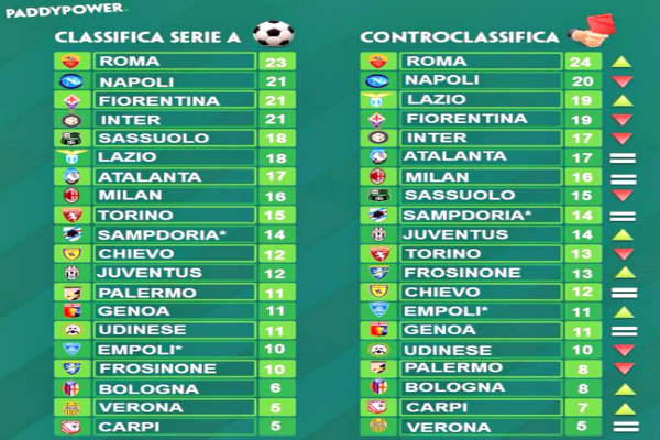 L’agenzia di scommesse onilne PaddyPower.it ha stilato una speciale classifica del campionato di serie A, senza presunti errori da parte dei direttori di gara. In questa nuova graduatoria, il Palermo avrebbe addirittura tre punti in meno rispetto a quanto ne ha oggi, ovvero 8 punti a condividere il terzultimo posto con il Bologna.