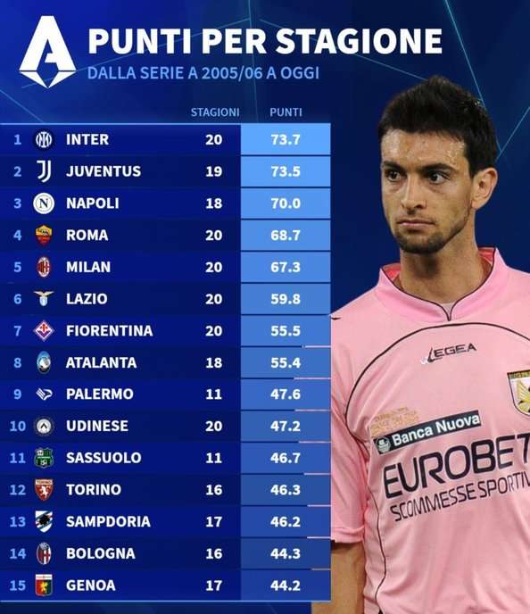 Il portale Transfermarkt.it, infatti, ha calcolato la media dei punti degli ultimi vent’anni di Serie A. In questa classifica, il Palermo si trova al nono posto, con 47.6 punti, nonostante un numero di stagioni inferiore rispetto alle altre squadre che sono presenti in questa statistica. Di seguito la classifica: