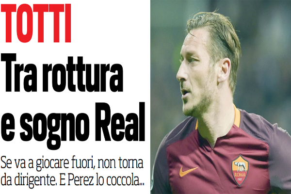 “La storia di Francesco Totti alla Roma rischia di avere un finale amaro, un epilogo pieno di fiele. Pallotta gli ha dato il benservito, rappresentando una situazione condivisa: tutti i dirigenti sono d’accordo sul fatto che Totti smetta con il calcio giocato. O meglio: tutti ritengono che non può più giocare nella Roma. Perchè Francesco ha una sola idea ben chiara in testa: vuole continuare a giocare. Dopo il brutto colpo, un pugno nello stomaco, delle dichiarazioni del presidente, questi sono i giorni delle riflessioni in famiglia. Francesco si sente ancora un giocatore e Ilary lo spinge a continuare. Sa quanto starebbe male ad anticipare l’addio. La soluzione in famiglia la troveranno. Qualche sondaggio c’è stato. Emirati Arabi, Stati Uniti. Ma non solo. Anche Ferrero farebbe i salti mortali (non i ponti d’oro, non ne avrebbe la possibilità…) per portarlo a Genova. Ma in Italia Francesco non vorrebbe restare, anche se nella condizione di uomo ferito può succedere di tutto. E può succedere di tutto anche nel suo futuro, perchè una volta sfilata la maglia giallorossa, la sua seconda pelle, che senso avrebbe tornare da dirigente? Con quale feeling lavorerebbe con gli altri dirigenti che gli hanno impedito di coronare il suo sogno? Nessun dirigente lo ha chiamato dopo le esternazioni del presidente. Si incontrano a Trigoria, buongiorno e buonasera. Pallotta è ripartito da Madrid senza neanche salutare i giocatori, Francesco era rimasto al colloquio dei giorni precedenti e alla necessità di aggiornarsi. Ma nessuna proposta economica gli è stata neppure accennata. sogno real. La situazione è precipitata. E a Madrid il capitano della Roma ha ricevuto grandi attestati di stima, che lo hanno emozionato. Prima al suo ingresso al campo con la standing ovation del Santiago Bernabeu e poi negli spogliatoi. Francesco è andato a salutare i giocatori nel loro vestuario e ha incontrato anche il presidente Florentino Perez. Ha donato una maglia anche a lui, con una dedica. Su quella maglia Florentino ha aggiunto, di suo pugno, un pensiero affettuoso: «All’unico giocatore che mi ha detto di no». Scherzi, battute. Totti e il presidente del Real si sono lasciati scambiandosi i contatti. Anche il fratello di Florentino aveva espresso il desiderio di avere una sua maglia, Francesco ha assicurato di fargliela avere. Da questi attestati di stima può nascere qualcosa. Totti ha sempre considerato il Real la sua seconda squadra, l’unica per la quale ha vacillato quando aveva già deciso di legarsi a vita alla Roma. Ci saranno contatti, a Madrid Totti ha molti estimatori e potrebbe dare il suo contributo part time in una squadra di campioni. Le magliette con il suo nome andrebbero a ruba. l’amico ritrovato. In questa situazione di grande delusione Francesco ha ricomposto il rapporto con Spalletti, dopo la sua intervista televisiva che aveva creato un po’ di tensione. I due si sono parlati, il tecnico ha mantenuto la sua posizione di coerenza e correttezza nei confronti del capitano. L’allenatore gli ha detto che sta cercando di capire se potrà contare su di lui per la prossima stagione. Avere Totti (anche part time) o non averlo fa una certa differenza. E ieri Francesco è tornato ad allenarsi con i compagni con tanta rabbia in corpo. Grandi numeri, grandi giocate e gol. Ma hanno deciso che nella Roma non può più giocare”. Questo quanto si legge sull’edizione odierna de “Il Corriere dello Sport”.