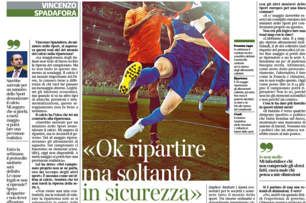 Il ministro dello Sport Vincenzo Spadafora ha rilasciato un’intervista a Il Corriere della Sera: “La maggioranza degli italiani non vede di buon occhio la ripresa del campionato, ma io non bado in questo momento ai sondaggi. Il calcio è un mondo importante del Paese, lo conosco bene a differenza di chi vuol far passare un messaggio diverso. Legittimi gli interessi economici, ma quando si va su altro tipo di attacchi, pressioni e strumentalizzazioni, questo atteggiamento non fa bene a nessuno. Sarebbe surreale per un ministro dello Sport demonizzare il calcio. Mi auguro di ripartire, ma lo deciderà il governo. Dal 18 maggio riprenderanno gli allenamenti di squadra. Sul campionato ci baseremo su elementi scientifici, oggi non disponibili. A metà maggio si potrà fare una previsione realistica”.