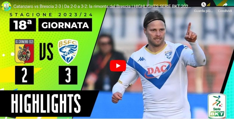 Il match della 18esima giornata di Serie B tra Catanzaro e Brescia termina con il risultato di 2 a 3. Ecco gli highlights dell’incontro: