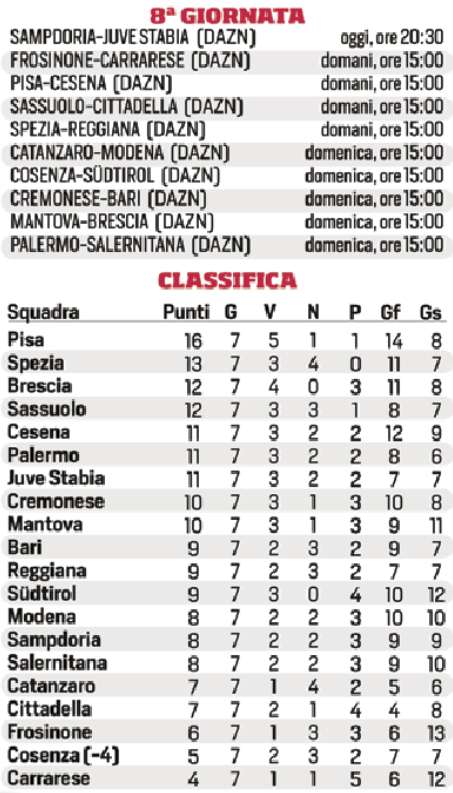 Ecco il programma dell’8ª giornata del campionato di Serie B: