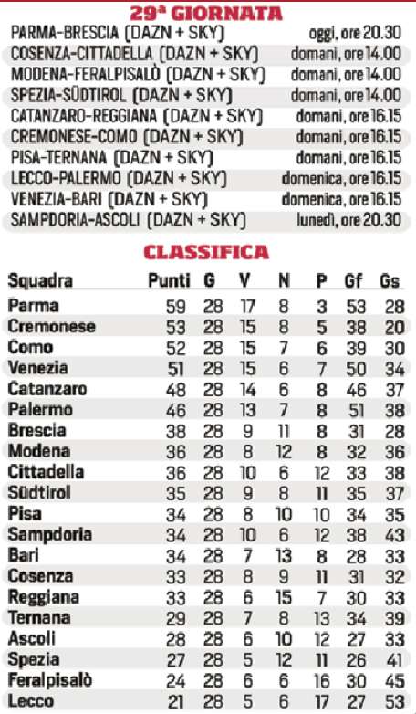 Parte oggi la 29a giornata di Serie B, con l’anticipo tra Parma e Brescia.