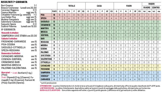 Dopo la 7ª giornata del campionato, il Pisa si conferma in testa con 16 punti, seguito da Spezia e Sassuolo rispettivamente a 13 e 12 punti. La lotta per le posizioni di vertice è serrata, con squadre come Cremonese, Mantova e Brescia che inseguono da vicino. Nella parte bassa della classifica, Sampdoria, Cosenza (penalizzato) e Carrarese cercano di recuperare terreno per evitare la zona retrocessione.