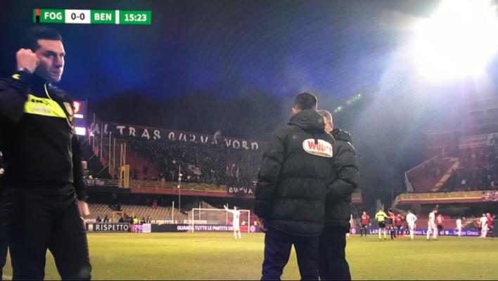 Foggia-Benevento, gara valida per la 25^ giornata del campionato di serie B, è stata momentaneamente sospesa dopo circa 16 minuti di gioco a causa del lancio di numerosi petardi da parte della tifoseria beneventana. Una volta placati gli animi, la gara ha ripreso il suo naturale svolgimento dopo quasi 2 minuti di sospensione. In alto la foto in questione.