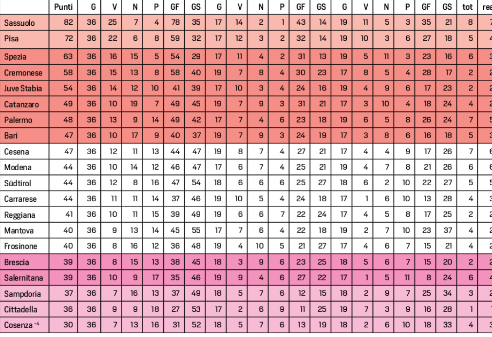 La lotta per i playoff è ancora apertissima: squadre come Catanzaro, Juve Stabia, Palermo e Cesena si giocano le ultime carte per una posizione favorevole, mentre in fondo alla classifica ci sono incroci salvezza da brividi, come Modena-Brescia e Sampdoria-Salernitana.