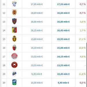 Terminata la sessione invernale di calciomercato, diverse sono state le squadre che hanno eseguito diversi movimenti sia in entrata che in uscita. Transfermarkt, come di consueto, fornisce la propria stima del valore delle rose aggiornata.