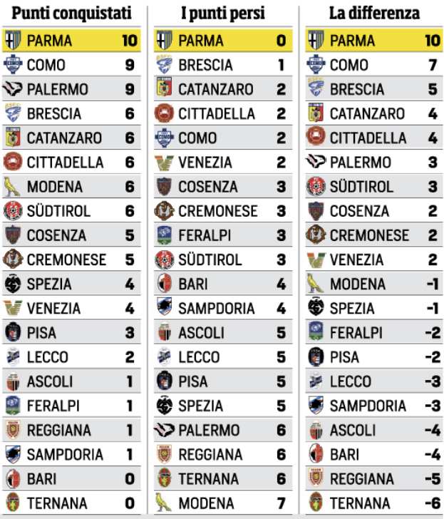PECCHIA PRIMO IN TUTTO. L’undici di Fabio Pecchia non è soltanto la migliore nel computo dei punti persi, ma è al primo posto anche nella classifica di quelli guadagnati con un vistoso +10. Alle sue spalle, a quota 9, troviamo il Como ed il Palermo che vanta, peraltro, due dei tre eredi di Renato Cesarini segnalatisi come implacabili nei finali di gara in questo campionato.