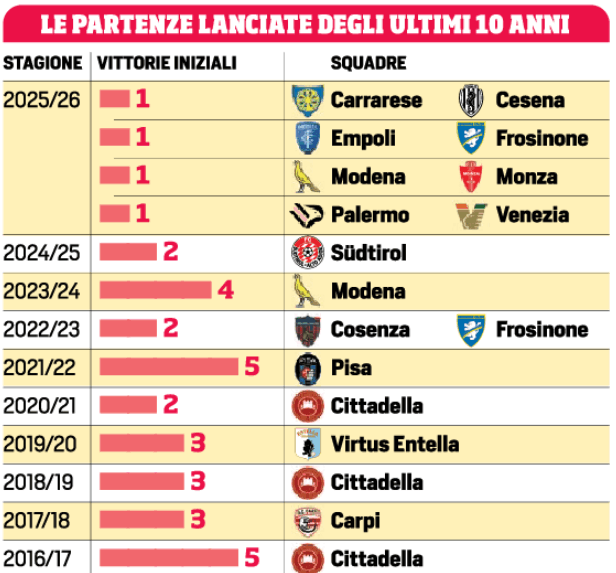 Pierluigi Capuano, nell’analisi per il Corriere dello Sport, ricorda anche i precedenti più recenti di partenze sprint. Lo scorso anno fu il Sudtirol di Valente a guidare la classifica con due vittorie consecutive, interrotte poi dalla sconfitta a Carrara. Ancora meglio il Modena di Bianco nel 2023/24 con un poker di successi. Nel nuovo millennio, da segnalare le cinque vittorie di fila del Pisa 2021/22 di D’Angelo, del Cittadella 2016/17 di Venturato, del Sassuolo 2012/13 di Di Francesco, del Brescia 2007/08 di Cosmi e del Torino 2004/05 di Ezio Rossi. Storicamente resta imbattuto il record del Brescia 1940/41 con sette vittorie consecutive.