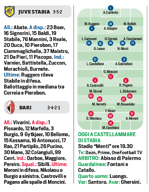 Serie B, oggi si recupera Juve Stabia-Bari. Le probabili formazioni