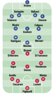 A disposizione: 1 Desplanches, 12 Nespola, 2 Graves, 3 Lund, 15 Marconi, 18 Nedelcearu, 6 Stulac, 20 Vasic, 80 M. Coulibaly, 7 Mancuso, 27 Soleri, 30 Valente. Indisponibili: Buttaro, Insigne. Squalificati: – Diffidati: – Ultime: Di Francesco sostituisce Insigne.