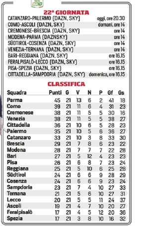 Parte oggi la 22a giornata di Serie B. Questo il programma completo:
