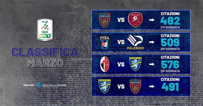 Attraverso i propri social la Lega Serie B riporta le statistiche de “L’Eco della Stampa” che riguardano i match più menzionati sul web nel mese di Marzo. Tra queste anche Pisa-Palermo.