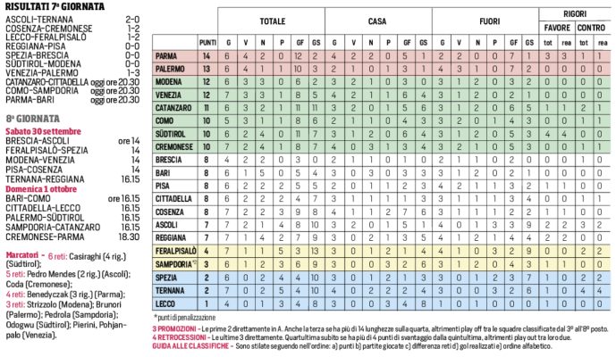 Serie B, si conclude la 7a giornata. Il programma e la classifica aggiornata