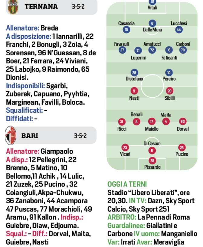 L’edizione odierna de “Il Corriere dello Sport” si sofferma sulle probabili formazioni del match tra Ternana e Bari valido per i playout serie B.