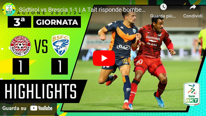 Termina 1-1 il match di serie B tra Sudtirol e Brescia.