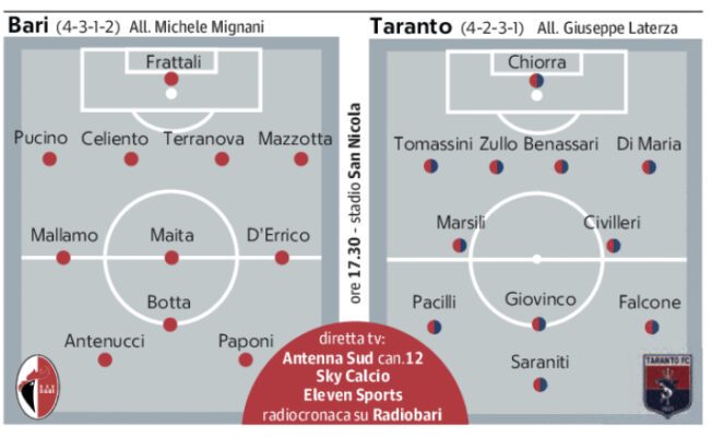 Al San Nicola ci saranno 10mila tifosi biancorossi, la metà di quelli che assistettero all’altro derby con il Foggia. Quelli del Taranto, hanno scortato la squadra sino al casello autostradale di Massafra, per incoraggiare i propri beniamini a poche ore dal derby. Sul piano tecnico, la classifica dice che il pronostico è tutto dalla parte del Bari, ma la componente emotiva del match potrebbe ridurre e di molto le distanze, sino a rimescolare le carte in gioco.