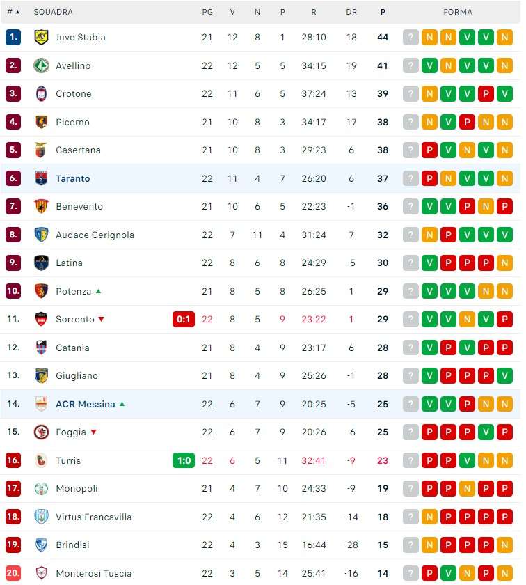 Serie C Girone C: il Messina vince 1 a 0 contro il Taranto. La classifica aggiornata