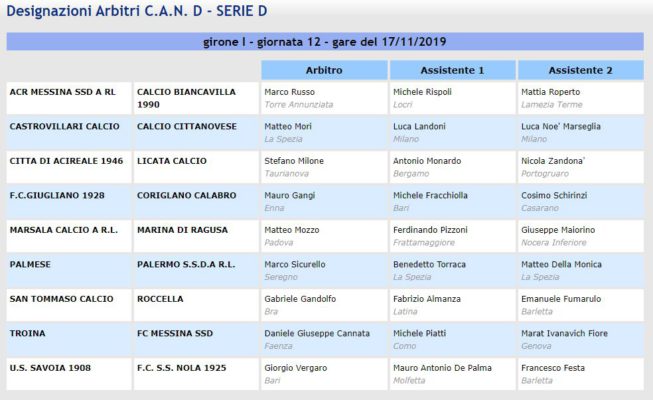Sono state diffuse le designazioni arbitrali della 12a giornata del girone I di Serie D. Palmese-Palermo sarà arbitrata da Marco Sicurello. Il fischietto di Seregno sarà coadiuvato dagli assistenti Benedetto Torraca e Matteo Della Monica, entrambi di La Spezia.