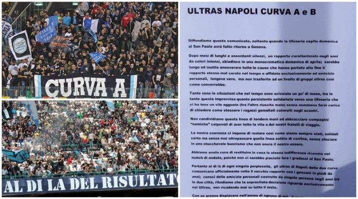 «Sarebbe lungo ed inutile annoverare tutte le cause che hanno portato alla fine il rapporto stesso mal curato nel tempo e affidato esclusivamente ad amicizie personali, longeve vero, ma non trasferite ad un livello di gruppi ultras così come converrebbe. Tante sono le soluzioni che con il tempo sono scivolate un po’ di mano, tra le tante questa improvvisa quanto persistente solidarietà verso una tifoseria che ci ha teso un vile agguato senza nemmeno farsi carico di chiedere come stessero i ragazzi gemellati coinvolti negli scontri. Non condividiamo questa linea di tendere mani ed abbracciare compagini nemiche colpevoli di aver tolto la vita a dei nostri fratelli di viaggio. La nostra coerenza ci impone di restare così come siamo sempre stati, solidali certo, ma senza mai oltrepassare quella linea sottile di confine. Senza sfociare in uno stucchevole buonismo che non onora il nostro essere. Abbiamo avuto cura di restituire in casa la stessa indifferenza ricevuta nel match di andata, poiché non ci sarebbe piaciuto fare i gradassi al San Paolo – termina la lettera – Pertanto al di là di ogni singola perplessità, gli ultras di Napoli delle due curve comunicano ufficialmente rotto il vecchio rapporto con i genoani in piedi da anni. Consci delle amicizie personali costruite da singole persone negli anni tra le due città, ribadiamo che la sopracitata decisione riguarda esclusivamente noi Ultras, non ricadendo mai su tutto il resto. Con un grosso dispiacere nell’animo di ognuno di noi, il nostro essere fieri e coerenti ci ha imposto questa scelta oramai non più rimandabile».