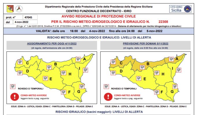 La Protezione Civile Regionale ha diffuso un avviso di allerta arancione per il rischio meteo-idrogeologico e idraulico per temporali valido da oggi pomeriggio e fino alle ore 24.00 di domani, sabato 5 novembre.