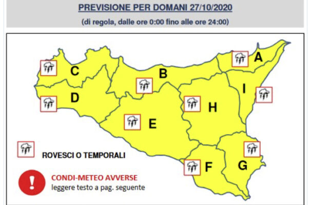 Dalle prime ore di domani, si prevedono infatti precipitazioni, a prevalente carattere di rovescio o temporale, sulla regione in estensione dal pomeriggio-sera alla Calabria. I fenomeni saranno accompagnati da rovesci di forte intensità, frequente attività elettrica, locali grandinate e forti raffiche di vento. Sulla base dei fenomeni previsti è stata valutata l’allerta gialla. Ma il maltempo che nell’Isola arriva dopo un weekend che molti hanno trascorso al mare, avrà comunque i giorni contati. A partire da giovedì 29 ottobre, e per tutto il prossimo weekend, tornerà il bel tempo con un’anticipo dell’estate di San Martino: un robusto campo di alta pressione avvolgerà con il suo carico di tiepida stabilità tutto il Paese.