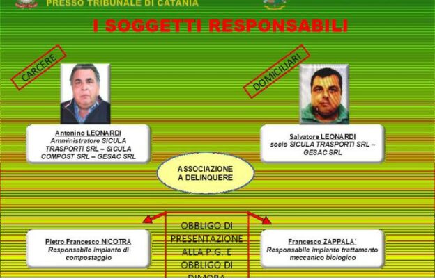 Nicotra e Zappalà insieme ai fratelli Salvatore e Antonino Leonardi, quest’ultimo quale capo e promotore, costituivano secondo gli investigatori un’associazione a delinquere finalizzata alla commissione reiterata di attività organizzate per il traffico illecito di rifiuti e di frode in pubbliche forniture nonché alla pervasiva pratica corruttiva quale strumento utile a eludere i controlli e a ottenere dalle pubbliche amministrazioni competenti provvedimenti amministrativi favorevoli.