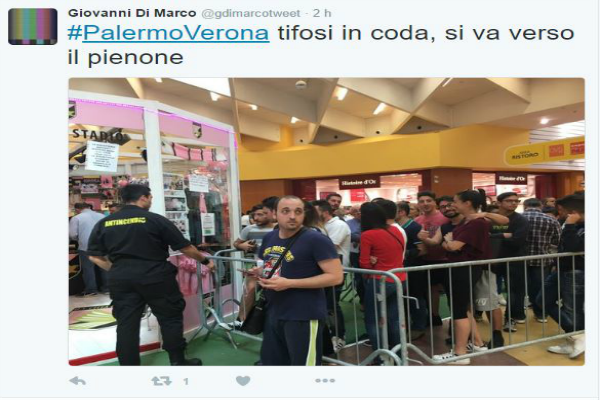 Giovanni Di Marco, giornalista di Sky Sport, ha pubblicato sul proprio profilo Twitter uno scatto che ritrae numerosi tifosi in fila per acquistare un biglietto per assistere al match di domenica sera tra Palermo ed Hellas Verona. In alto la foto della situazione alla ricevitoria del centro commerciale “Conca d’Oro”.