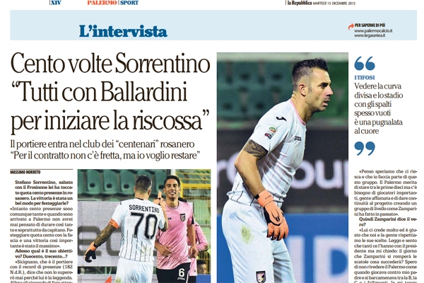 Il capitano del Palermo Stefano Sorrentino, è intervenuto ai microfoni dell’edizione locale de “La Repubblica”. Ecco alcune delle sue parole: «Dopo la vittoria sul Frosinone abbiamo vissuto una giornata post gara serena come non ci capitava da tanto. Tutto ciò fa bene al gruppo che, a parte me e Gilardino, è molto ma molto giovane, con alcuni alla prima esperienza in serie A e tanti giovani. La vittoria ci dà fiducia e ci allontana dalla zona calda. Abbiamo vinto uno scontro diretto e adesso dobbiamo dare continuità anche perché sarebbe bellissimo fare punti a Genova e trascorrere un sereno Natale insieme ai nostri tifosi».