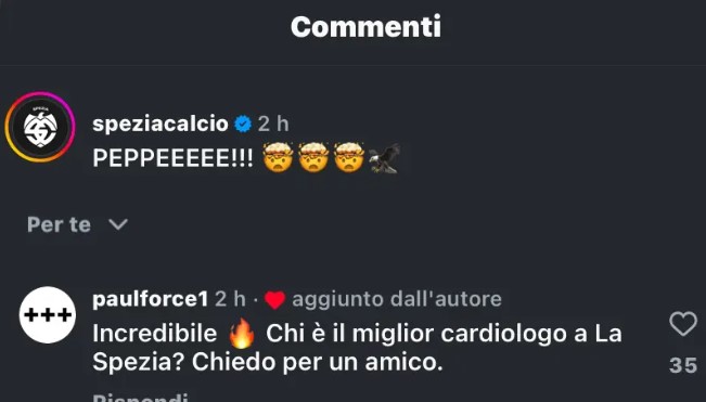 Negli ultimi giorni in casa Spezia è terminata l’era Platek, che ha ceduto le quote societarie al fondo FC32. Dopo il clamoroso 2 a 2 contro il Palermo, grazie a due reti in pieno recupero, i bianconeri hanno evitato una sconfitta che sembrava ormai certa. Infatti, il nuovo vicepresidente del club, Paul Francis, che ha guardato la partita dagli Stati Uniti, ha ironizzato sotto ad un post della pagina Instagram degli Aquilotti con il seguente commento: “Chi è il miglior cardiologo a La Spezia? Chiedo per un amico”.