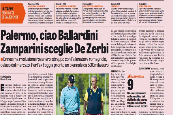 Gazzetta dello Sport: “Palermo, ciao Ballardini. Zamparini sceglie De Zerbi, pronto biennale da 500mila euro”