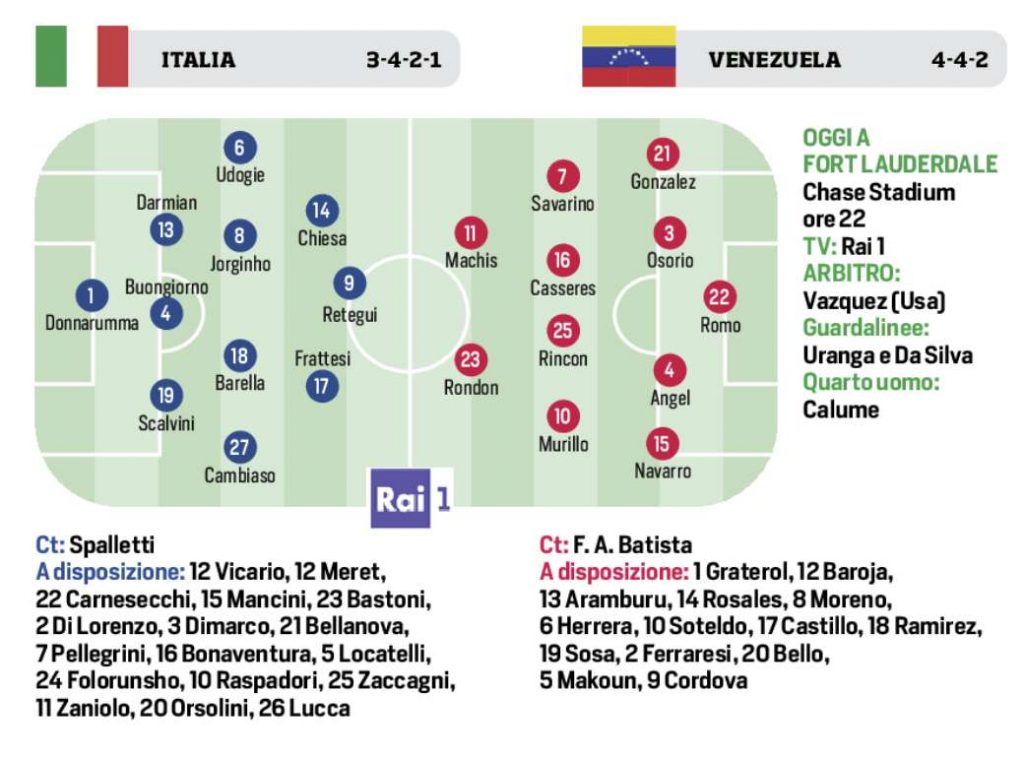 SCELTE. Stasera il Venezuela (un minuto di silenzio per la scomparsa di Joe Barone) e domenica l’Ecuador. Sei sostituzioni consentite. Spalletti presenterà due formazioni molto diverse. Il 3-4-2-1 di Fort Lauderdale si dovrebbe appoggiare su una difesa a tre formata da Scalvini, Buongiorno e Darmian, favorito su Bastoni. Diversi ballottaggi. Lunedì all’Acqua Acetosa, Barella e Jorginho erano i due mediani, Frattesi e Chiesa gli incursori a ridosso di Retegui. Il 3-4-2-1 può tendere verso il 3-5-2 se entrerà Raspadori. Vedremo. Ci sono tante possibilità. Le corsie esterne dovrebbero toccare a Cambiaso e Udogie.