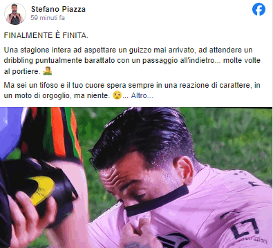 Intanto il noto comico palermitano Stefano Piazza, attraverso i propri social, ha pubblicato un post che sintetizza la stagione disastrosa del Palermo.