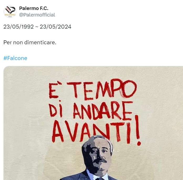 Sono passati 31 anni da quando Giovanni Falcone perse la vita nella strage di Capaci. Nell’attentato del 23 maggio 1992 persero la vita anche Francesca Morvillo, (moglie del magistrato palermitano) e gli agenti della scorta Vito Schifani, Rocco Dicillo e Antonio Montinaro. Il Palermo, attraverso il proprio profilo X, ha pubblicato un post in memoria di Giovanni Falcone e delle vittime di mafia: