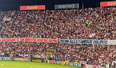 Allo stadio Dall’Ara di Bologna, i tifosi rossoblu hanno esposto il seguente striscione: “Lavorare un diritto, vivere di più. Vicini alle famiglie”.