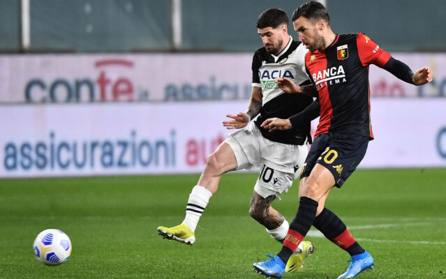 GenoaÕs Kevin Strootman (R) and UdineseÕs Rodrigo de Paul (L) in action during the Italian Serie Serie A match, Genoa CFC vs Udinese Calcio at Luigi Ferraris stadium in Genoa, Italy, 13 March 2021. ANSA/LUCA ZENNARO