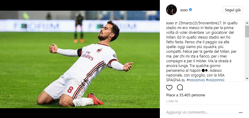 Il calciatore del Milan Suso, autore del gol del 2-0 nella sfida di ieri contro il Sassuolo ha postato una foto sul proprio profilo Instagram dove scrive: “25marzo15/5novembre17. In quello stadio mi ero messo in testa per la prima volta di voler diventare ‘un giocatore’ del Milan. Ed in quello stesso stadio ieri ho fatto festa. Penso che il peggio sia alle spalle: oggi siamo più squadra, più compatti. Felice per la gente del Milan, per me, per chi mi sta a fianco, per i miei compagni e per il mister. Ma la strada è ancora lunga. Tra qualche giorno penseremo al Napoli ?⚫. Adesso nazionale, con orgoglio, con la MIA SPAGNA ??. #noiconvoi #voiconnoi#adelante “. Di seguito il post dello spagnolo: