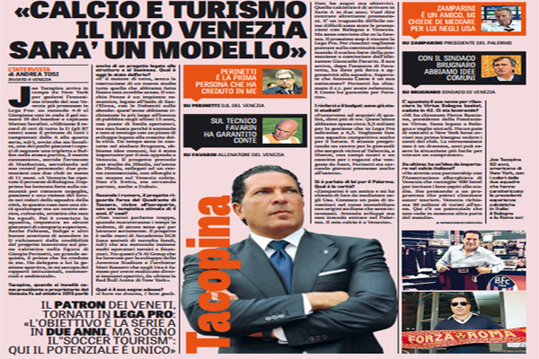 Tacopina: «Calcio e Turismo, il mio Venezia sarà un modello. Palermo? Vi dico la verità…»