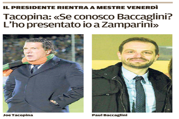 “«Se conosco Paul Baccaglini, il nuovo presidente del Palermo? Sono la persona che l’ha presentato a Maurizio Zamparini…». Joe Tacopina è al settimo cielo per il volo del Venezia, ma svela anche il percorso compiuto dal suo connazionale per arrivare al vertice del club rosanero. «Si sono visti per la prima volta nel mio ufficio, anche se conosco molto meglio il suo partner Cascio, mi dispiace che Baccaglini lo abbia tagliato fuori. Su di lui ci sono ancora tante domande senza risposta»”. Questo un estratto dell’intervista al patron del Venezia, Joe Tacopina sul quotidiano “La Nuova di Venezia e Mestre”.
