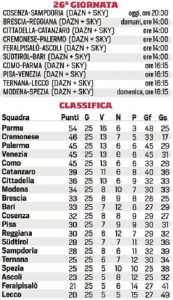 Serie B, comincia la 26a giornata. Il programma e la classifica aggiornata