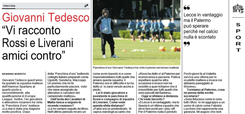 L’edizione odierna de “La Repubblica” riporta un’intervista a Giovanni Tedesco, allenatore dei maltesi dell’Hamrun Spartans ed ex calciatore del Palermo: «La mia è stata una stagione molto positiva. Dopo ventisette anni ho riportato l’Hamrun al quarto posto e in Europa. La nostra è una società di grandi tradizioni. Lo scorso anno giocavano qui Zaccardo e Succi e la società è molto ambiziosa». Anche lei ha ricevuto riconoscimenti personali? «Sì, ho vinto l’edizione maltese della “Panchina d’oro” battendo colleghi italiani preparati come Ugolotti, Sanderra, Maccoppi. Un premio che mi fa particolarmente piacere, visto che viene assegnato da allenatori e calciatori del campionato maltese». Dall’isola dei Cavalieri di Malta riesce a seguire le vicende rosanero? «Le ho sempre seguite da tifoso. Nell’ultimo periodo mi ero un poco allontanato perché nella vecchia gestione c’era stata qualcosa che non mi era piaciuta a livello personale. Con il ritorno di Rossi è cambiato tutto» Perché? «Perché stimo Rossi e soprattutto ha risposto alla chiamata del Palermo così come avrei risposto io e come risponderebbero tutti quelli che amano questa squadra. Il Palermo era in difficoltà e lui ha detto sì. Io sarei venuto anche a piedi». Lei è stato giocatore e assistente in panchina di Rossi e compagno di squadra di Liverani. Come vede questa sfida distanza? «Fabio era un predestinato. Si capiva standogli accanto che sarebbe diventato un bravo allenatore. Inoltre ha fatto la gavetta e gli step necessari perché giocare e fare il tecnico non è la stessa cosa. Anche Rossi conosce bene le qualità di Liverani che era un vero punto di riferimento per tutta la squadra». E Rossi?