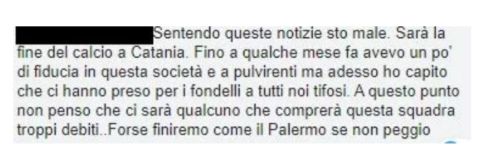 Il futuro del Catania non è mai stato così incerto. Il club etneo ha liquidato alcuni dei propri tesserati tramite un messaggio WhatsApp sconcertante: “Cari ragazzi, nel rinnovare a voi e alle vostre famiglie gli auguri di un Buon Natale e di un Felice Anno Nuovo, con la riapertura delle liste di trasferimento abbiamo il dovere di esporvi con chiarezza il quadro economico della ns. Società…. Il Calcio Catania Spa per la ben nota situazione debitoria non potrà far fronte agli adempimenti economici così come attualmente in essere. La vita del Catania è primaria ad ogni cosa così che ci sembra giusto che troviate una squadra che vi garantisca di poter avere soddisfatte le vostre esigenze tecniche ed economiche. Nessuna pretesa sarà da noi avanzata alle eventuali squadre che si faranno avanti. Certi della vs. comprensione vi salutiamo cordialmente. Calcio Catania Spa”. La divulgazione di tale audio ha scatenato le ire dei tifosi etnei sui social. C’è chi attacca coloro che hanno difeso allo strenuo questa società, c’è chi se la prende con il club ma persino con i giocatori, rei di aver reso pubblico il messaggio. Il Catania sta attualmente vivendo una situazione drammatica, una crisi economica irreversibile che non lascia spazio ad interpretazioni. In basso alcuni del commenti pubblicati dai tifosi eteni sui social.