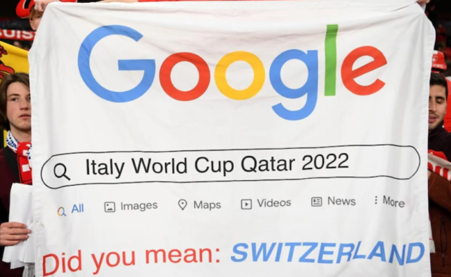 Un tifoso svizzero a Wembley, durante la sfida contro l’Inghilterra, ha preso in giro gli Azzurri per l’eliminazione dal Mondiale usando la ricerca di Google.