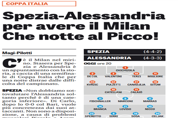 “C’è il Milan nel mirino. Stasera per Spezia e Alessandria è un appuntamento con la storia, a caccia di una semifinale di Coppa Italia che per una notte distrae dalle difficolta del campionato. SPEZIA «Non dobbiamo sottovalutare l’Alessandria soltanto perché è di una categoria inferiore». Di Carlo, dopo lo 0-0 col Bari, vuole più concretezza dai suoi attaccanti. Non sono a disposizione, a causa di problemi muscolari Piccolo e Acampora. La formazione non dovrebbe discostarsi molto da quella presentata al Picco svenerdì sera, con la possibilità di Kvrzic di giocare dall’inizio invece di Ciurria, la sostituzione di Juande con Canadjija (in ballottaggio con Errasti) e un attacco diverso: accanto a Calaiò, uno tra Catellani e Nenè. Novemila i biglietti venduti, si va verso il tutto esaurito per una serata che la città attende con trepidazione. ALESSANDRIA Quasi 2.000 tifosi in viaggio verso La Spezia, più un maxi schermo in Piazza Duomo per chi non potrà seguire la squadra, allestito dall’Associazione Commercianti”. Questo quanto si legge sull’edizione odierna de “La Gazzetta dello Sport”.