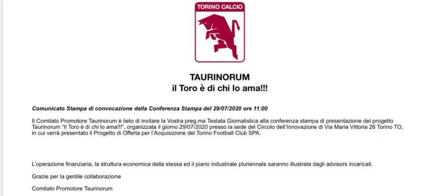 Una cordata pronta a rilevare il Torino. Notizie frammentarie, ma è stata annunciata una conferenza stampa per mercoledì 29 luglio. Ad annunciare l’intenzione di presentare un’offerta al presidente Cairo è il Comitato Promotore Taurinorum. Secondo quanto riportato da “La Stampa” sarebbero pronti 100 milioni di euro e a capo della cordata ci sarebbe Paolo Ferrero, imprenditore e vice-presidente del Circolo dell’Innovazione.