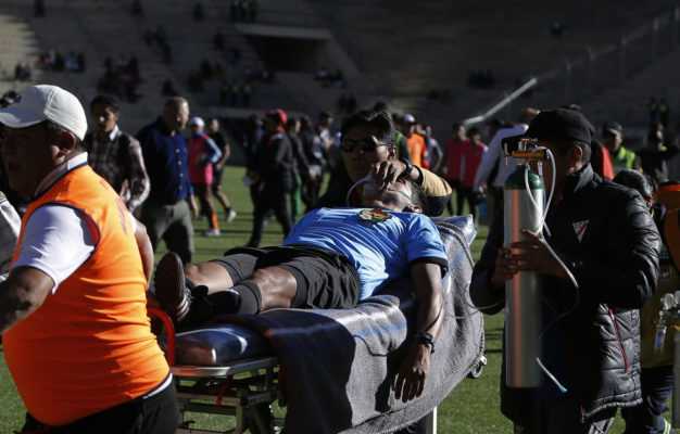 Referee Victor Hugo Hurtado is transported off the field to the hospital after fainting during a soccer game between the Always Ready team and Oriente Petrolero team, part of the "Apertura" local soccer tournament in El Alto, Bolivia, Sunday, May 19, 2019. Hurtado, 31, died later at the hospital of cardiac arrest, according to Fernando Costa, president of the Always Ready soccer club. (AP Photo/Juan Carlos Usnayo)